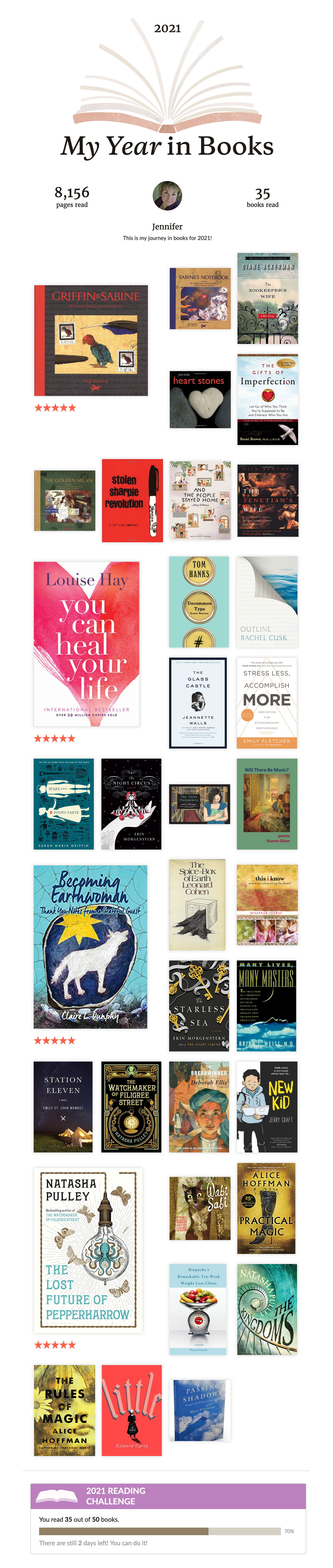 If I read as much as it feels like I didn’t, I suspect I would have surpassed my Goodreads Reading Challenge goal. I’m not really as far off as I thought…numerically, anyhow. According to my Goodreads 2021 report, I’ve read 35 books this year, 70% of my goal of 50 books.