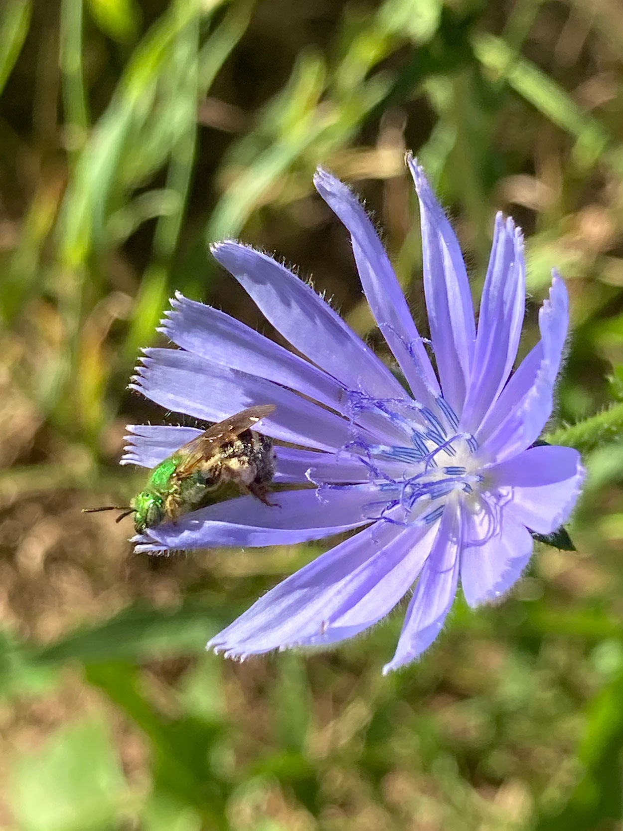 ABOVE: The adoration of Common chicory (Cichorium intybus) by Bicolored Agapostemon Sweat Bee (Agapostemon viriscens). Photo and poem by Jen Payne.